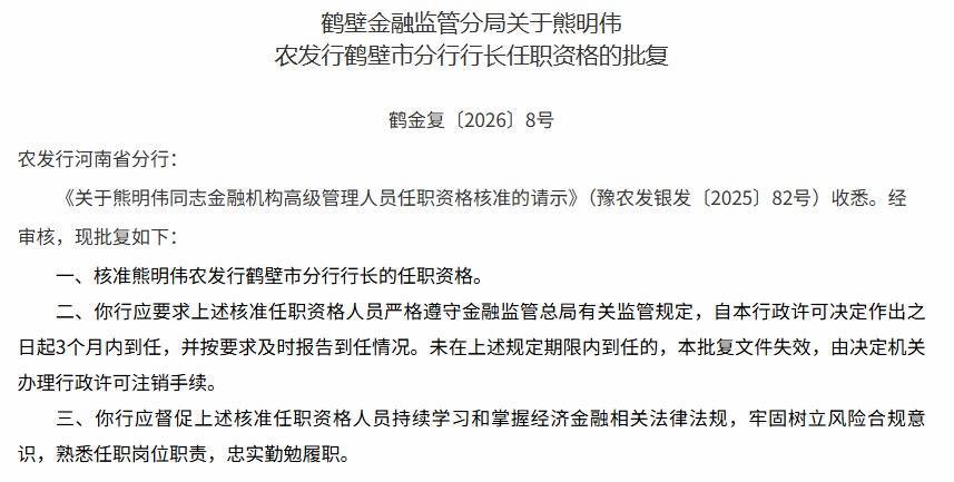 【大河财立方音书】2月9日音书,国度金融监督处分总局鹤壁监管分局近日批复,核准熊明伟中国农业发展银行鹤壁市分行行长的任职阅历。