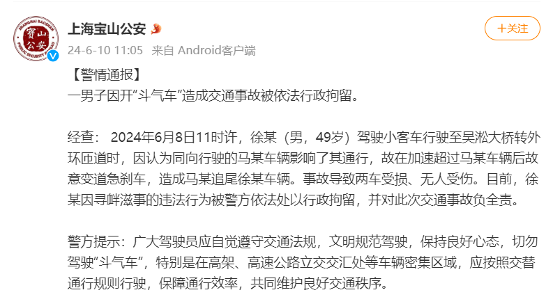 6月10日,上海市公安局宝山分局官方微博发布一则警情通报: