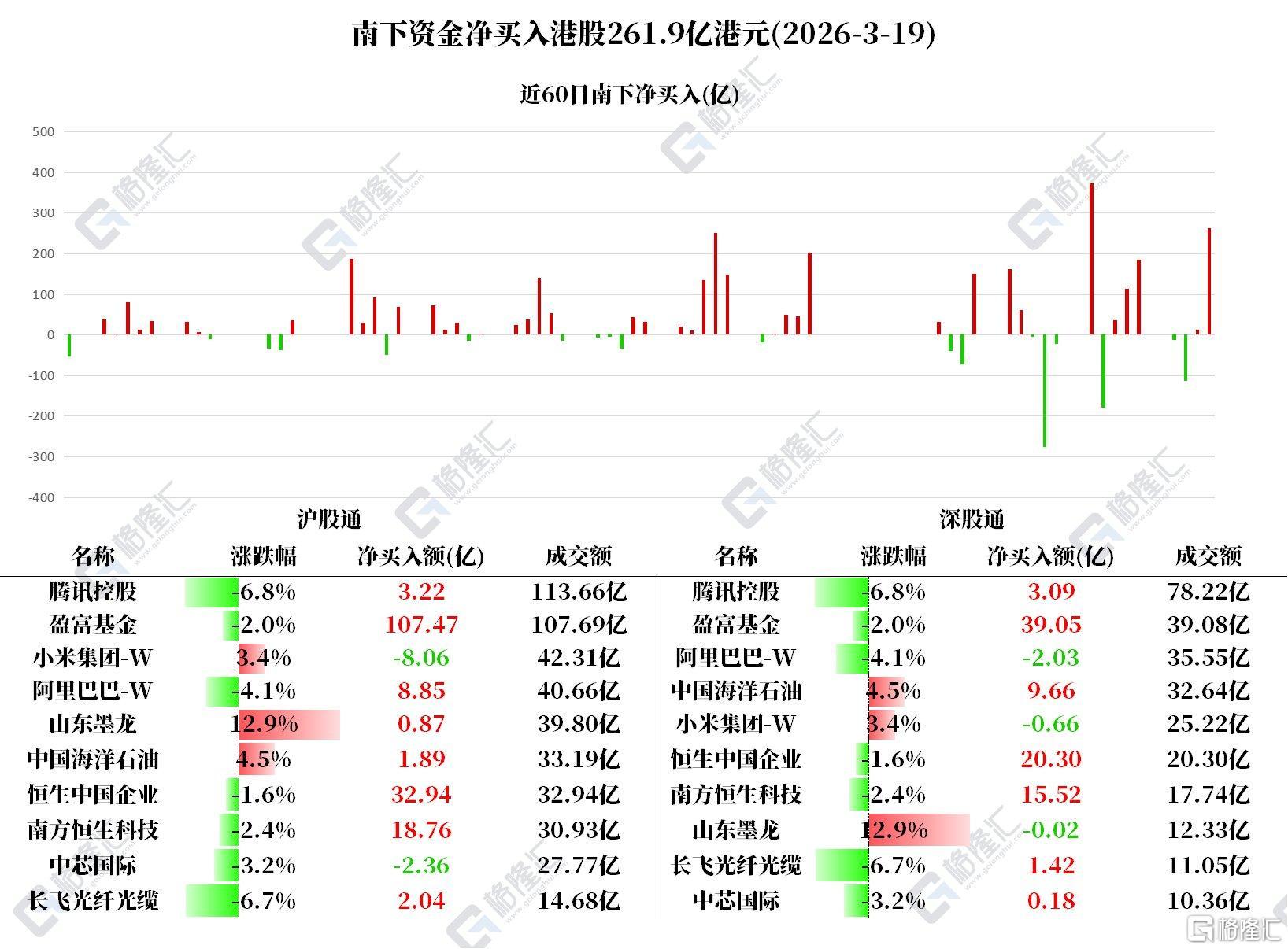 其中:净买入盈富基金146.5亿港元、恒生中国企业53.23亿港元、南边恒生科技34.28亿港元、中国海洋石油11.55亿港元、阿里巴巴-W 6.82亿港元、腾讯控股6.3亿港元、长飞光纤光缆3.45亿港元;净卖出小米集团-W 8.72亿港元、中芯海外2.17亿港元。