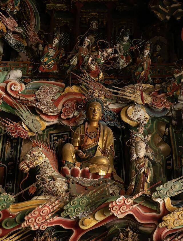 殿内的中枢,当然是中央佛坛上的三大士,不雅音、文殊、普贤三位菩萨居中而坐,其中不雅音菩萨的体量最大,是全殿的主尊,约两米高,面庞宽仁,衣袂轻扬,浑身围着马王爷、韦陀、罗汉还有一众礼佛东谈主,背后的悬塑,还精致地讲着善财孺子五十三参的故事,每一个细节都藏着巧想。左侧是普贤菩萨,两侧有礼佛东谈主、龙王相伴,上方是炽盛光佛与十一曜;右侧是文殊菩萨,相同有礼佛东谈主、龙王、寿星蜂涌,上方则是玉皇大帝、十大太乙真东谈主,佛谈神祇相互烘托,莫得涓滴违和。而在佛坛最顶部,最让东谈主感触的野心出现了,释迦牟尼、孔子、老子三位三教祖师同坐一处,释迦牟尼居中,老子、孔子分列摆布,儒家的修身、谈家的无为、佛家的宽仁,就在这一方小小的顶部空间里完好意思和会,这不是粗略的泥像对付,而是明代民间信仰最果然的包容,是老庶民心里,对不同信仰、不同文化的接管与和会。