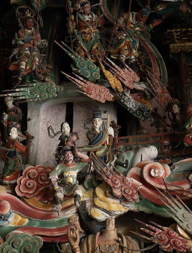 再看南北两侧的墙壁,也等于次间,自下而上的四层悬塑,各有侧重,各有乾坤。第一层沿着墙基罗列的是十八罗汉,每一尊都一米摆布高,姿态、神气莫得一个疏通的,有的闭目凝想,有的舒怀大笑,有的瞋目圆睁,有的垂头千里想,匠东谈主把每一尊罗汉的性情都刻进了眉眼之间,站在跟前,仿佛能感受到他们的喜怒无常。南北两壁的第二层,是释教的二十四诸天,这是佛国的护法团体,内部有老庶民再熟识不外的四大天王,还关连羽、后羿这些众所周知的东谈主物,神话与信仰交汇,等闲与圣洁相融,让东谈主看着就以为亲切。第三层是十二圆觉,泥像隆重正经,带着修行者的千里静;到了第四层,更是各路至人皆聚,玄教的玉皇大帝、三官大帝、八仙、二十八星宿,儒家的孔子与七十二弟子,释教的三十五佛,密密匝匝却又有板有眼,每一尊都有我方的位置,每一位都有我方的故事,也难怪老庶民会把这里叫作“全神庙”,三界诸神,儒谈佛圣,简直都能在这里找到身影。