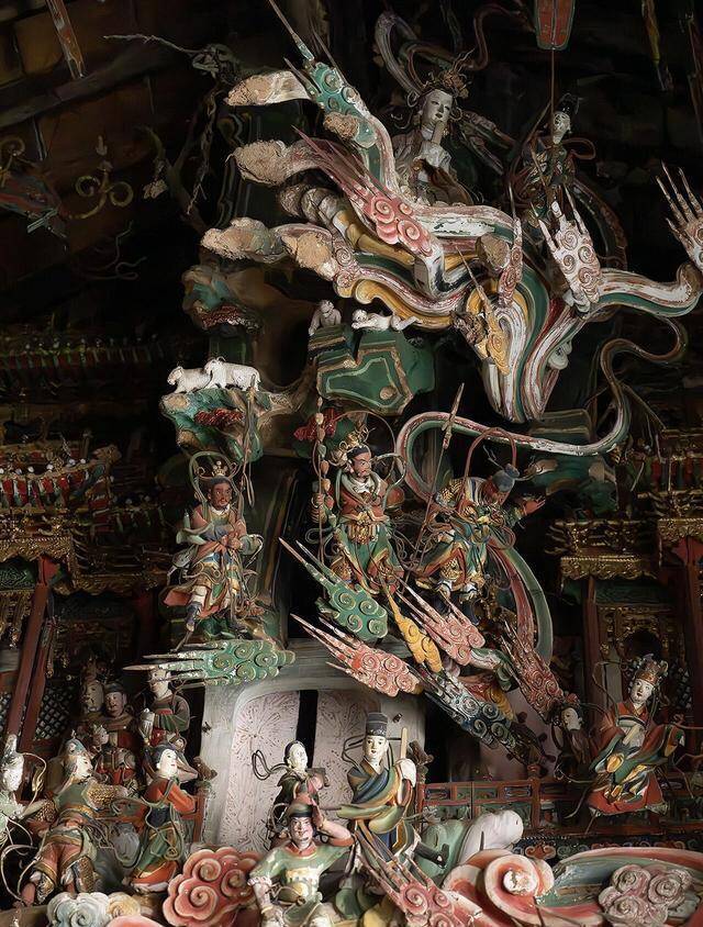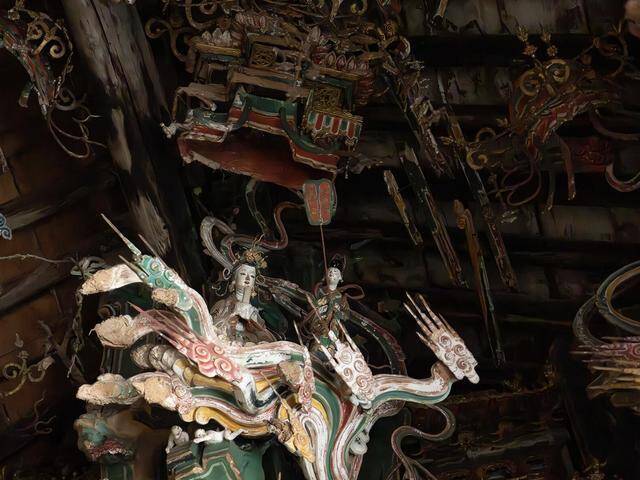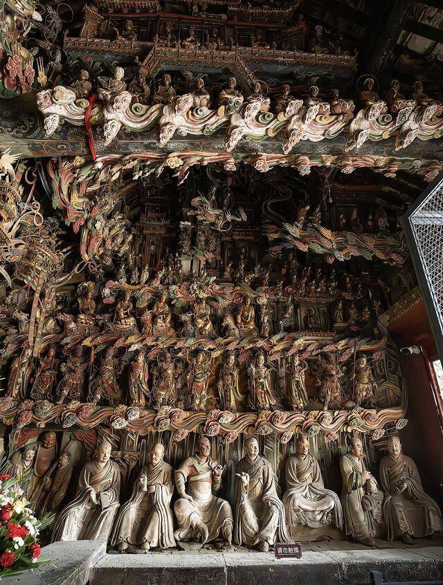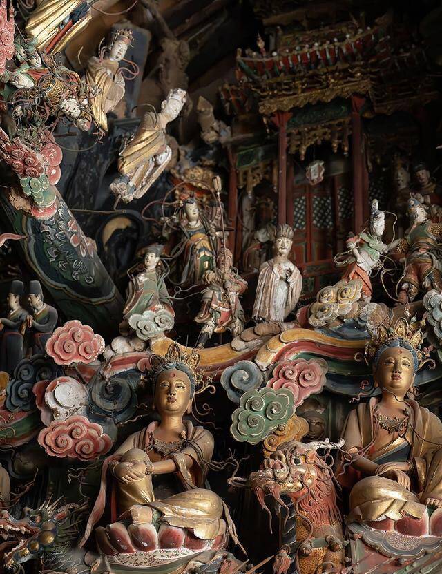 不雅音堂的正殿,也等于不雅音殿,是明万历九年到十一年,也等于1581到1583年的原构,四百多年当年,木构依旧稳重,殿内的彩塑更是完好意思留存,完整的有593尊,还有288尊残塑,加起来近九百尊泥像,挤在不算真切的殿堂里,儒、释、谈三教的神祇挤在一处,莫得流派之见,莫得教派纷争,就这样热防止闹地共处一堂,这在国内的古寺里,着实是有数。通盘正殿坐东朝西,布局看似混乱,实则端倪分解,从墙基到屋顶,纯洁皙白分红四层悬塑,所有泥像都靠木架悬插在墙体与梁架之间,四面悬空,眼下踩着祥云,浑身绕着仙气,立体感强到仿佛下一秒就会从空中走下来,也正因如斯,它才成了山西三大悬塑之一,这份技巧,放在今天依旧让东谈主叹服。