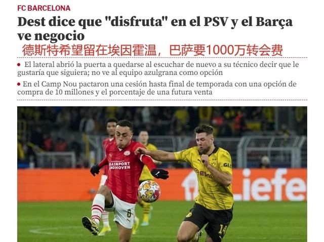 2020年,德斯特从阿贾克斯加盟巴萨,转会费2100万欧元。不外,德斯特的才能无法在巴萨存身,2022年夏天,巴萨将德斯特租出给AC米兰;昨年夏天,德斯特又被租出到埃因霍温。