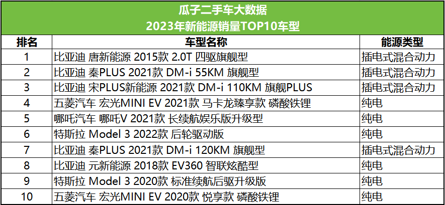 2024年的新动力市集将迎来一轮新的爆发,这也预示着新动力换车潮行将莅临。届时大都二手新动力车将插足市集,如何挑选是个痛楚。字据瓜子二手车2023年新动力车型销量榜单,最受市集招供的10款二手新动力车型如下。